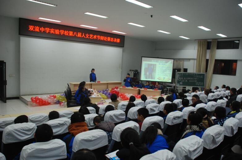 2015年12月29日晚六点半,双流中学实验学校第八届人文艺术节之辩论赛决赛在学术厅隆重举行,校领导高校长、张校长、刘主任、周主任隆重出席,参赛选手的家长、班主任应邀出席。