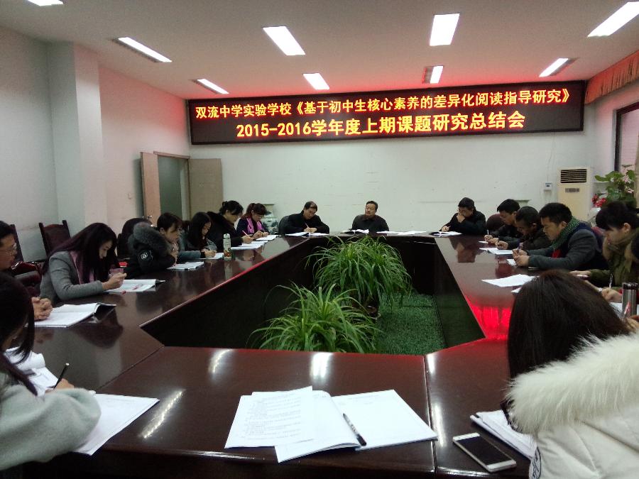 1月13日上午,双中实验校《基于初中生核心素养的差异化阅读指导》课题学期总结会在学校三会议室召开。会议由课题组组长刘瑛、杨燕主持,高校长、张校长、周主任、刘主任、文主任莅临会议。