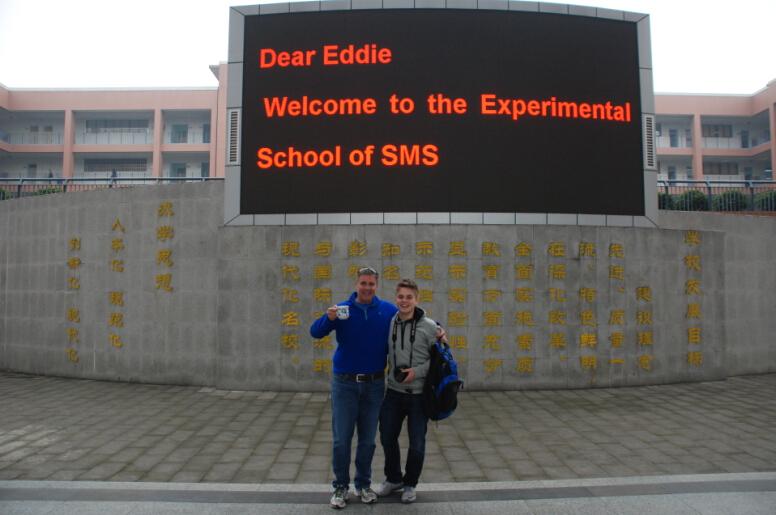 Eddie和父亲在学校欢迎标语前合影