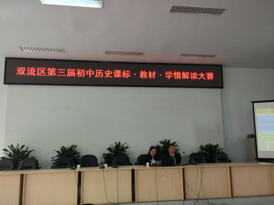 教师素质是实施课程改革、推进素质教育的关键。为了进一步加强我区历史教师师资队伍建设,提升各历史教师对于教材的理解运用能力,全面有效提高课堂教学质量,双流区第三届初中历史教材解读大赛于4月15日在我校学术厅进行。