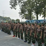 何强处长做军训总结。他说到,在本次军训中,全体参训学员展现了团结拼搏的精神,经过训练具备了基本的军事素质和技能,成果值得肯定。他希望同学们回到学校后努力学习科学文化知识,巩固和扩大军训成果。