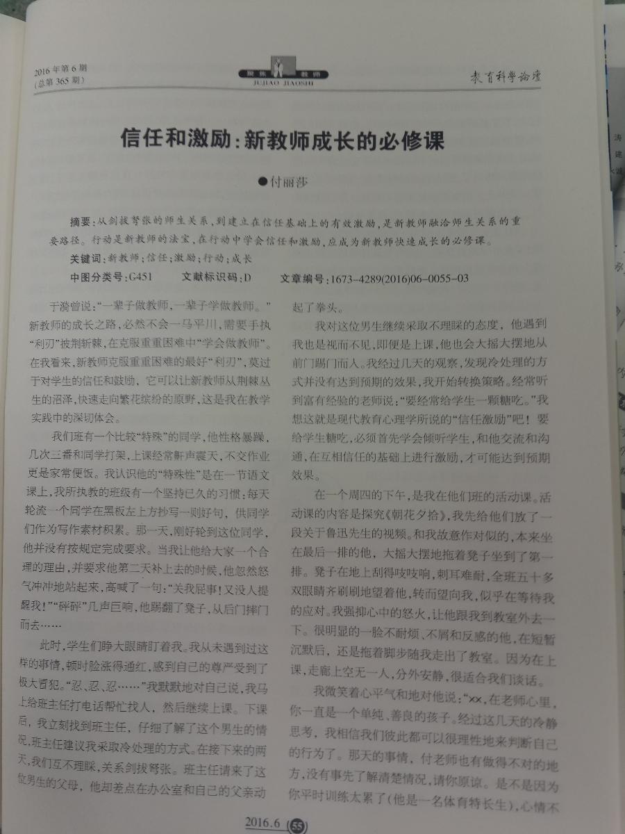 继双流中学实验学校语文组举行第一届“春芽杯”教科研论文比赛之后,语文组又陆续收获成果。何向老师的《中学生写作的歧与误》、付丽莎老师的《信任和激励:新教师成长必修课》、付兵老师的《酬乐天扬州初逢席上见赠》和《以读为本的古诗文教学》以及张薇老师的《对比:凸显孔乙己悲剧命运》等四位老师的五篇优秀论文分别发表在《教育科学论坛》【四川省教育厅主管,四川省教科所主办,中国核心期刊(遴选)数据库全文收录期刊】2016年第5、6、7、9期。