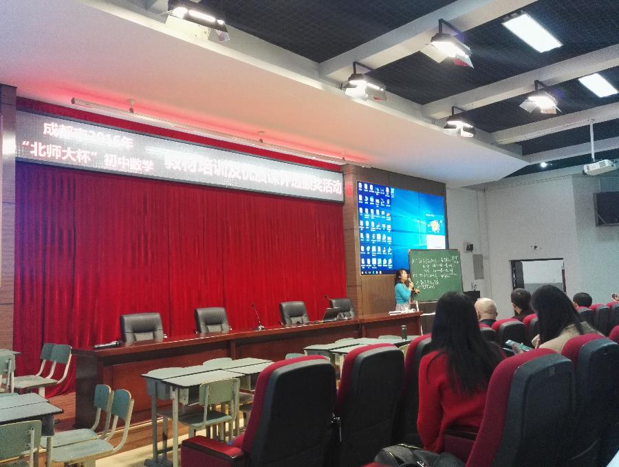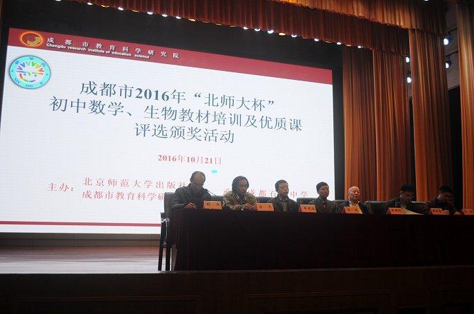 2016年10月21日,成都市2016年“北师大杯”初中数学教材培训及优质课颁奖活动在石室中学北湖校区隆重举行。北京师范大学出版社基础教育分社主编王建波博士,数学通报编辑室主任郑亚利老师,四川省教科所副所长石建先生,成都市教育科学研究院基础教育研究所所长乐天,副所长黄祥勇莅临现场。会议由成都市教育科学研究院基础教育研究所所长乐天主持,四川省教科所石建副所长对活动提出了要求和希望。石室中学北湖校区叶欣老师为参会老师呈现了一堂现场研讨展示课《一次函数的图象》,参会老师围绕课堂中教与学的策略进行充分研讨。教材专家王建波博士主讲《初中数学教材设计意图解读》、数学通报编辑室主任郑亚利老师主讲《撰写优质论文发表的注意事项》对参会骨干教师进行培训。
