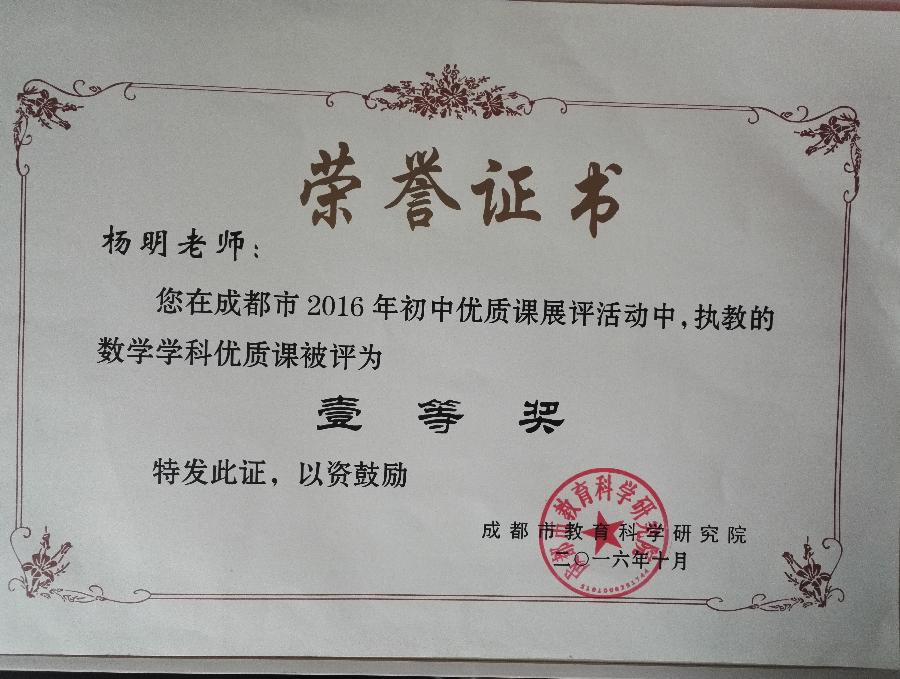 我校杨明老师获成都市2016年初中数学优质课评选一等奖