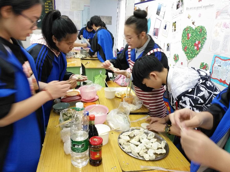 周五下午第四节班会课,由七年级班主任带领各班学生在本班教室进行包饺子生活体验活动。在活动现场,可以看出各班活动的前期准备十分充足。同学们带来了包饺子需要的面皮,以及各样的馅料和调味料。不可或缺的,碗筷、蒸锅等碗具也是一应俱全。打铃之后,各班热情高涨,开始包饺子。在班主任的细心指导下,孩子们开始学习如何调制美味的馅料,如何将馅料和饺子皮完美结合,包成好看的形状。而包饺子的整个过程充满了欢声笑语,细看,孩子们的脸上、手上都沾满了面粉,但仍然聚精会神地包着饺子,只是偶尔抬起头来指着同伴的脸大笑两声,可爱极了!