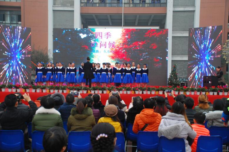 校舞蹈队的同学们用活力四射的开场舞点燃了全场的气氛。随后,丰富多彩的各类节目令人目不暇接。校合唱团的《踏雪寻梅》及《四季的问候》,由高中低三个不同声部的完美演绎将大家带入了音乐所表现的意境中;八年级文创班的《论语朗诵》,在悠悠筝声中,将古时先贤的警世恒言娓娓道来;双中实验附属小学的一年级同学们带来的英语音乐剧Sound of Music(《音乐之声》)更是一道亮丽的风景,稚嫩的童声,地道的英语,大胆的台风,完美的表演,让初中同学们,老师们和家长们赞不绝口。此外,还有英语短剧《狐假虎威》,《三打白骨精》,英语合唱Shalala,相声《如此中学生》,历史话剧《甘罗十二为使臣》,现场古筝表演和书画,四川打击乐团双中实验分团带来的打击乐《快乐地跳吧》等等精彩的节目。最后,七年级全体英语老师和美籍外教Jessie,澳大利亚籍外教Ian一起登上舞台,为大家带来了歌舞秀,在学生们的尖叫声中将汇演的气氛推到了顶点。