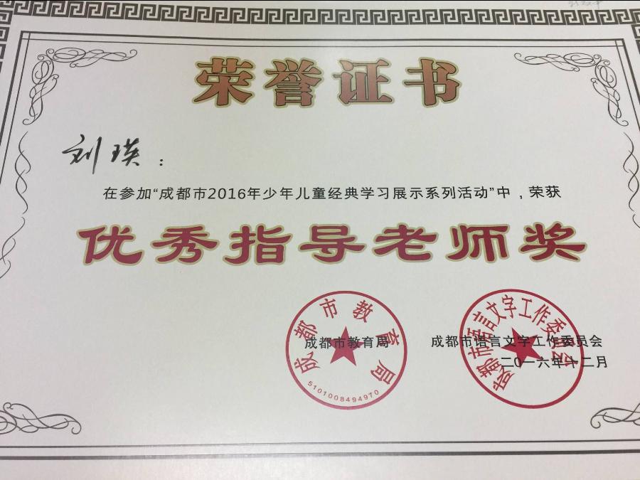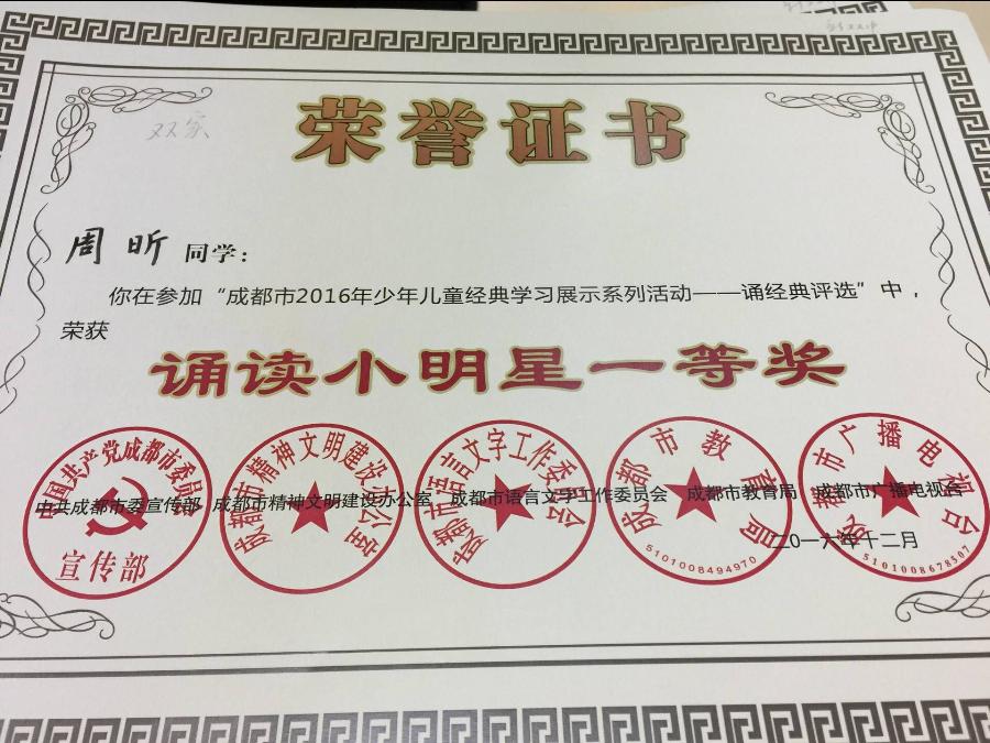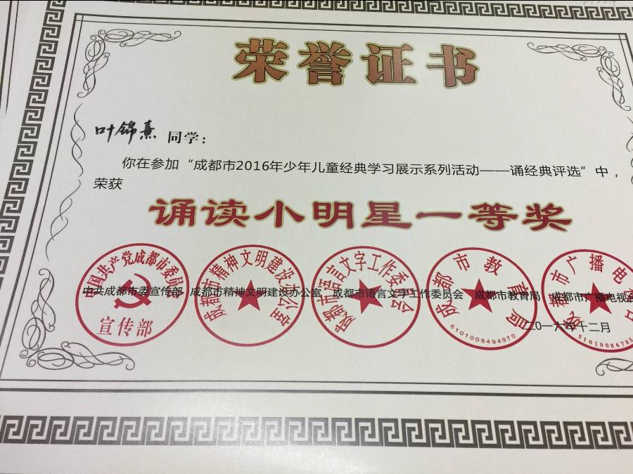 本次国学诵读活动按照小学低段、小学高段、中学组三个组别选拔学生参加。我校8年级15班的叶锦熹和8年级16班的周昕两位同学经过层层选拔,代表双流区参加了中学组的比赛。她们以从容的台风、标准的发音、抑扬顿挫的语调、巧妙的舞台设计赢得了评委和观众的热烈掌声。目前比赛结果揭晓,两位同学都获得了市级“诵读小明星一等奖”,刘瑛老师获“优秀指导老师奖”。(语文组)