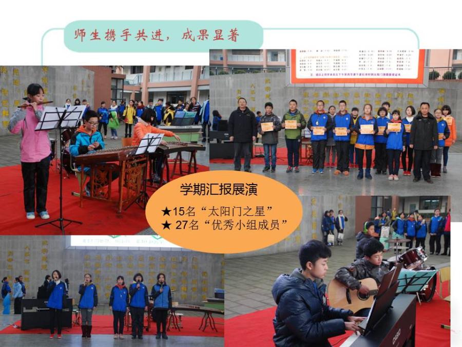 “太阳门之声”是我校小组研究性课题之一,它以课本内外结合的方式为有演艺兴趣爱好的同学搭建一个开放的展示舞台,既培养了学生的艺术素养,又锻炼孩子们舞台表演的胆量与自信。自2015年10月建立以来,得到了同学们的踊跃参与,在师生中产生广泛的影响。展演时为将音乐的魅力淋漓尽致的呈现给师生,都要经过学生自主准备节目——教师建议——学生反思——节目审定——周五预演五个环节的精心准备,师生们在美妙旋律的感染下,身心得以舒展,艺术素养得到进一步的提高。从课题中涌现出的优秀学生参加全国省市区校艺术类比赛均取得了优异的成绩。高雪、李尚蔚、祝瑞希等同学参加“星星火炬”中国青少年艺术英才大赛获四川赛区一二等奖。