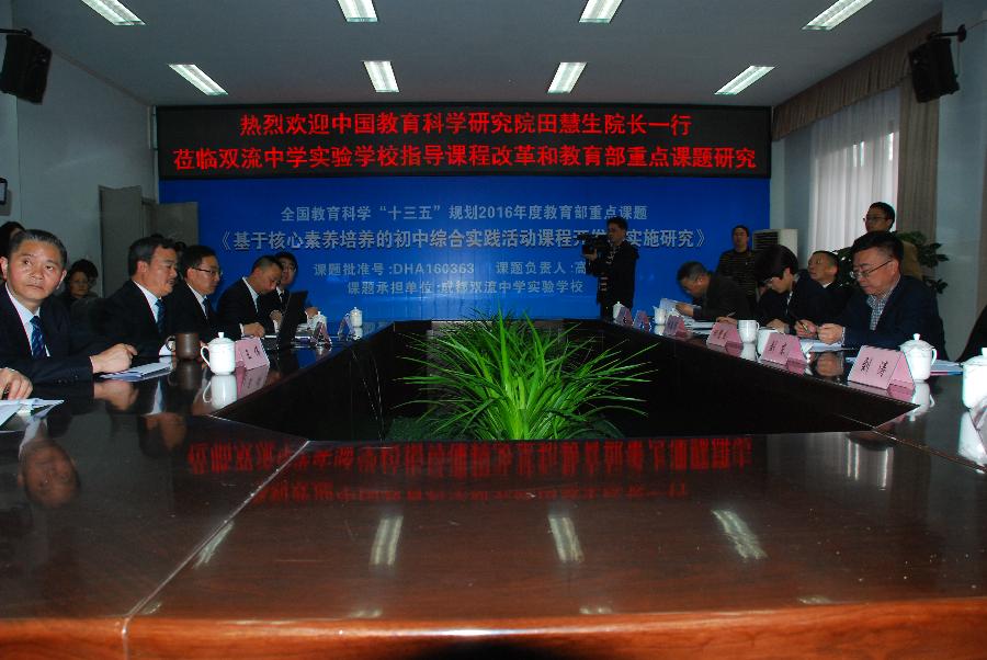 芳菲四月,春意抒怀。2017年4月6日,中国教育科学研究院院长、教育部基础教育课程教材发展中心主任田慧生,四川省人民政府教育督导团总督学、省教育厅党组成员刘东,四川省教育科学研究所所长刘涛一行莅临成都双流中学实验学校,指导课程改革和教育部重点课题“基于核心素养培养的初中综合实践活动课程开发与实施”研究。成都市双流区人民政府副区长杨春禧,成都市双流区教育局党组书记、局长李光纯,四川省教育科学研究所办公室主任焦蒲,成都市双流区教育研究与教师培训中心主任邱刚田陪同。