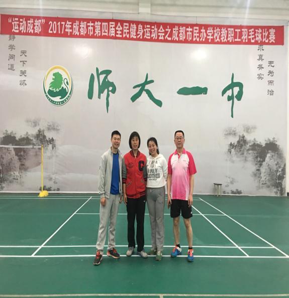 4月8日至4月9日,我校教职工组队参加了“运动成都”2017年成都市第四届全民健身运动会之成都民办学校教职工羽毛球比赛,获得团体二等奖。此次比赛是成都民办学校举办的第二届羽毛球比赛,由师大一中举办,比赛地点在师大一中羽毛球馆。我校由王伟副校长和刘尧树主任带队,派出胡平、叶朗、黄静和刘侦言4名老师,参加了男单、女单、男双、女双和混双全部5项比赛,从18个代表队中脱颖而出,取得了所有参赛项目全部进入决赛圈,团体总分二等奖的好成绩。